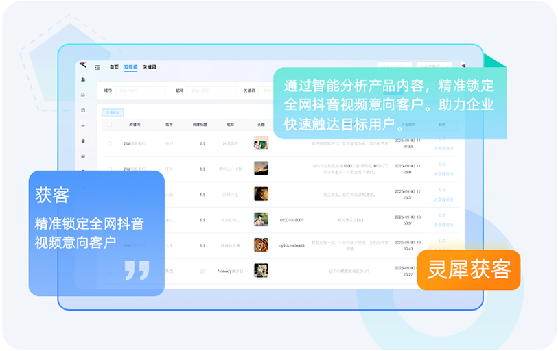 靈犀獲客,通過(guò)智能分析產(chǎn)品內容,精準鎖定全網(wǎng)抖音視頻意向客戶(hù)。實(shí)現高效流量引導,助力企業(yè)快速觸達目標用戶(hù),提升潛在客戶(hù)轉化率,為品牌創(chuàng )造更大價(jià)值。
